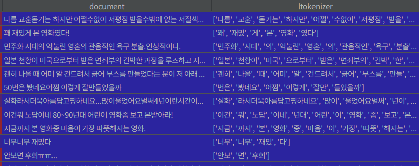 soynlp에서 제공하는 몇가지 토큰나이저 중에서 내가 쓰는 데이터와 가장 잘 맞는 토큰나이저는 ltokenizer였다.