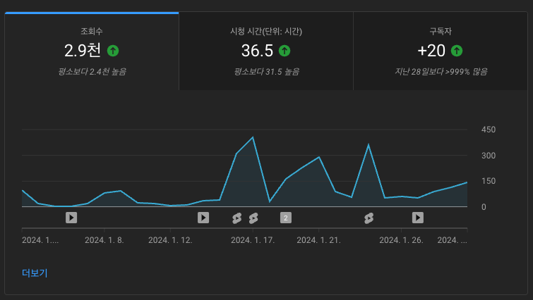채널이 워낙 작아 표본은 적지만 나름의 추세를 보면, 일반 영상을 올리고 1-2일정도 후에 조회수가 오르는 것을 알 수 있다.
