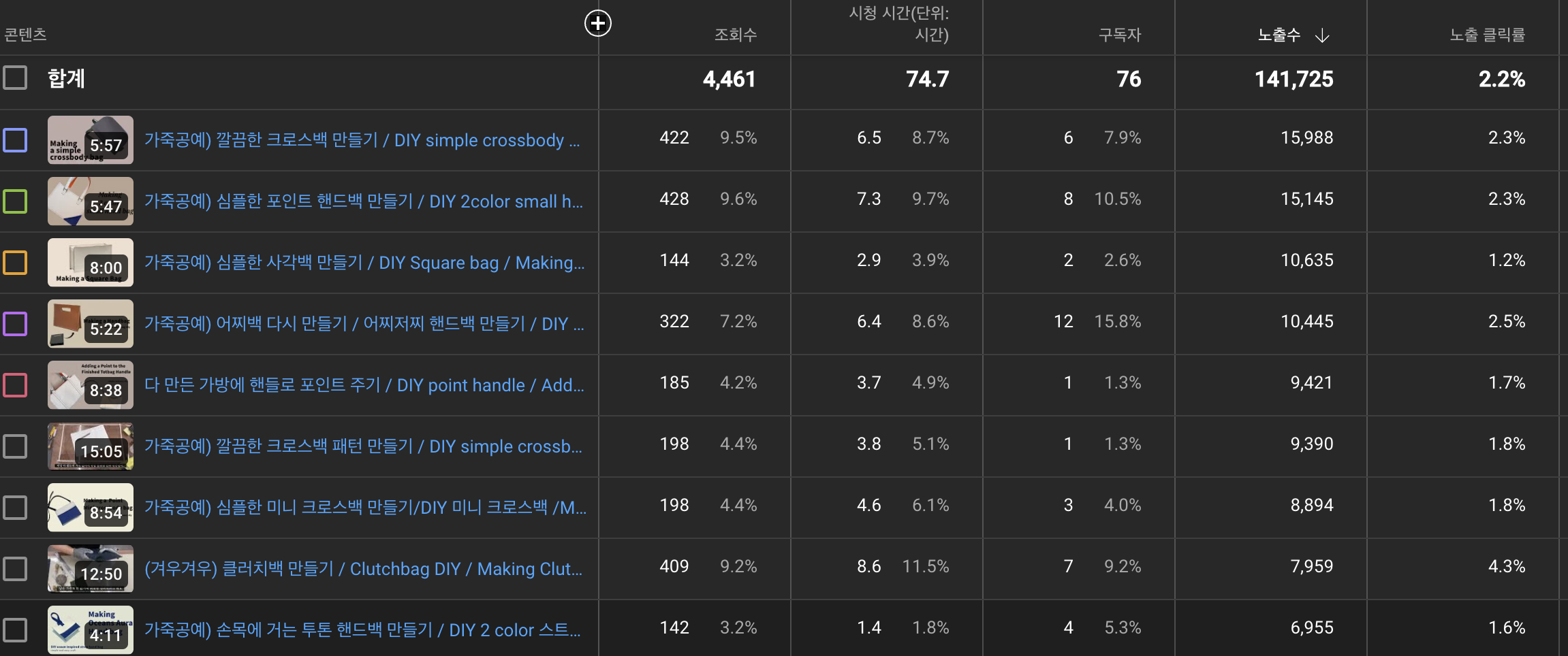 "어찌백 다시 만들기"와 "심플한 포인트 핸드백 만들기", "클러치백 만들기" 영상이 대략 30명 수준의 구독자를 만들었다.