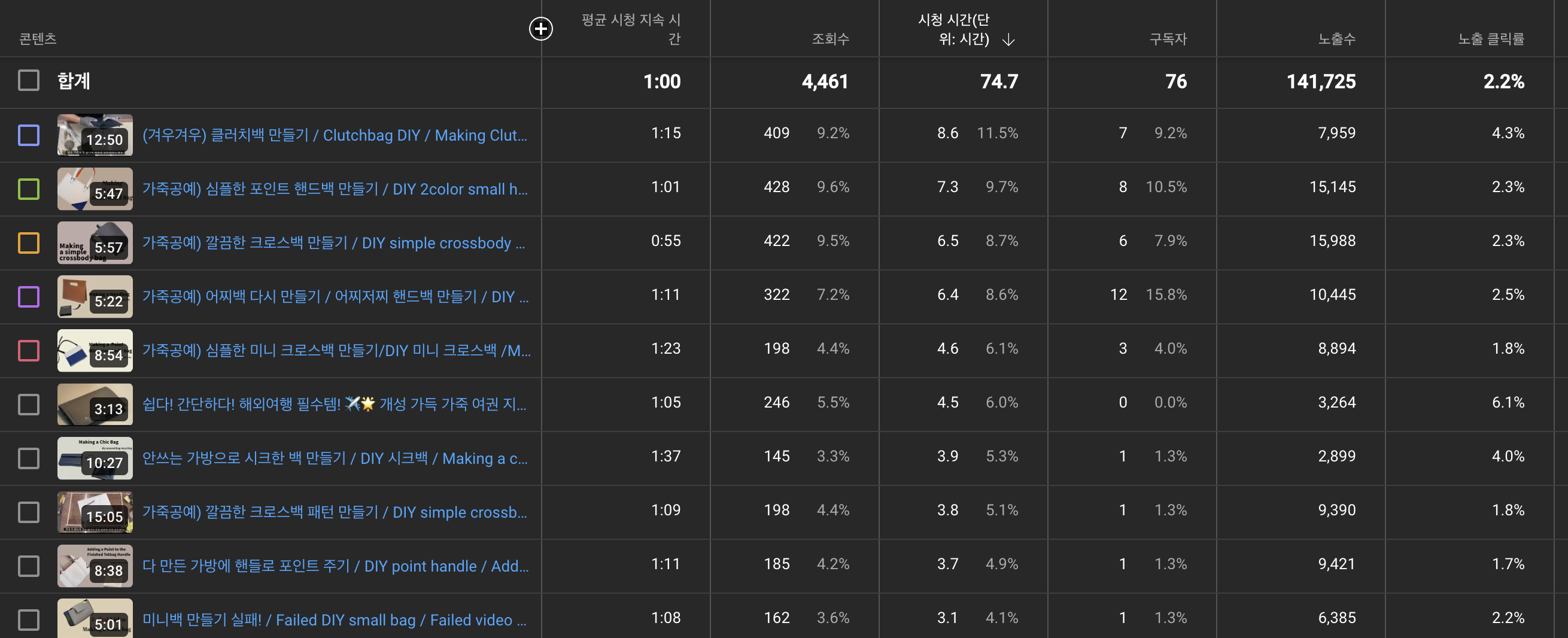 "어찌백 다시 만들기"와 "심플한 포인트 핸드백 만들기", "클러치백 만들기" 영상이 대략 30명 수준의 구독자를 만들었다.